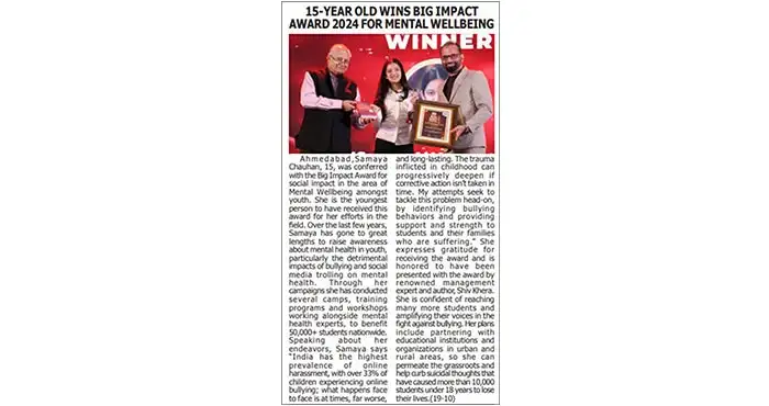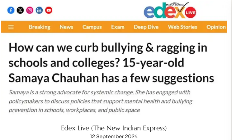 Pained by her classmates’ concerns around mental wellbeing, Samaya Chauhan felt compelled to campaign for and act in favour of those impacted. Through independent surveys and counselling, she sought to understand the reasons behind bullying behaviours and how to manage them, addressing both sides of the victim and the bully.